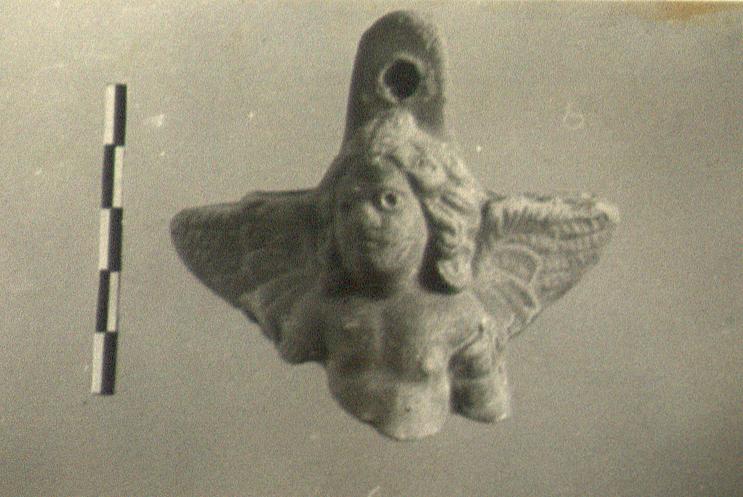 | Description: | Upper part of winged Eros, with pierced handle above head. Matte red paint. Red-buff clay. | |
