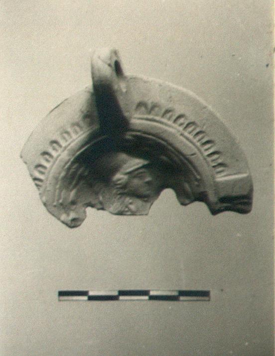 | Description: | Back half of lamp; ovules on rim. Pierced double-grooved handle. Single groove on bottom. Discus decorated with Athena in crested Corinthian helmet, right; framed by laurel wreath. Pale buff clay. Type XXVII of Corinth collection. | |