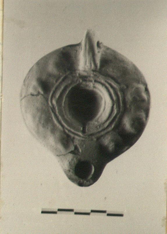 | Description: | Mended from two pieces; complete except for chips. Very faint impression; clusters on rim, plain discus with ridges around. Pierced handle; two grooves above, none below. On bottom, raised circle. Orange-buff clay, light buff at surface. Type XXVII of Corinth collection. | |