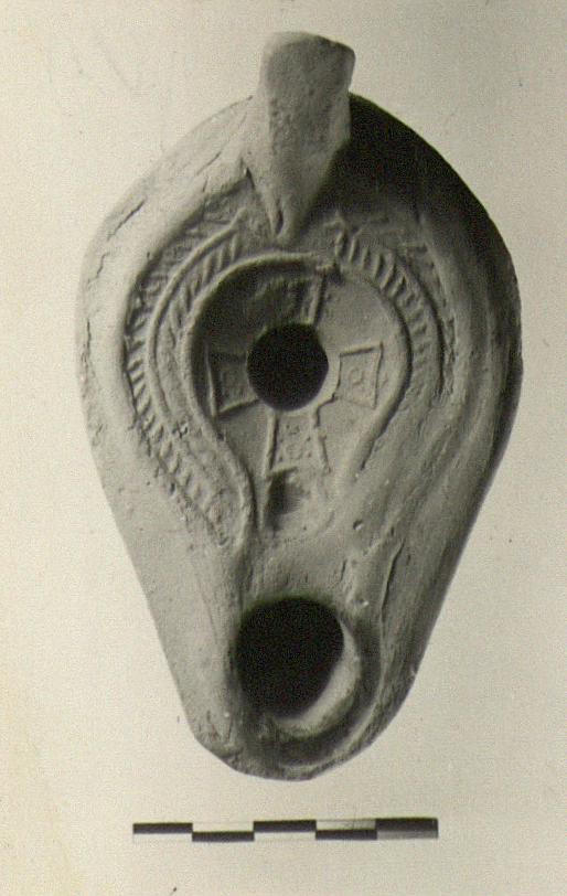 | Description: | Intact. Jewelled cross on discus; herringbone on rim. High knob handle. Raised ring on underside, with rib to base of handle. No glaze. Light reddish-brown clay, buff at surface. Type XXXI of Corinth collection. | |