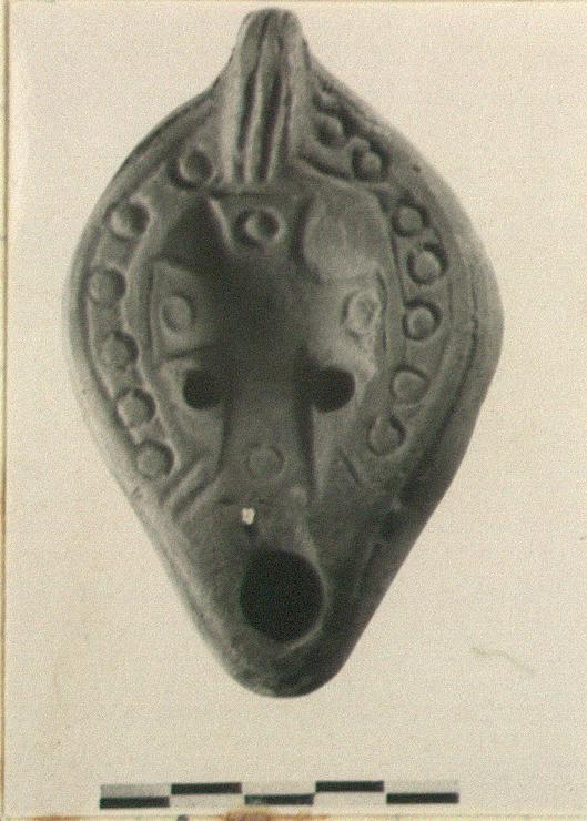 | Description: | Intact. Punched circles on rim; cross with punched circle at end of each arm on discus. Raised pattern on bottom; palm leaf made up of lozenges. Reddish-brown clay, burned black in many spots. Type XXVIII of Corinth collection. ADDENDA Also from same fill L 1711 (Π 258). | |