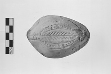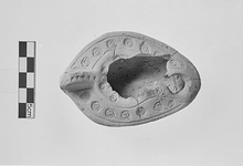 | Description: | Center of discus missing. Dotted circles on rim and around outer edge of discus. Palm leaf with border of dotted circles on bottom. Row of small dots on handle. No glaze. Buff clay. Type XXXI of Corinth collection. | |