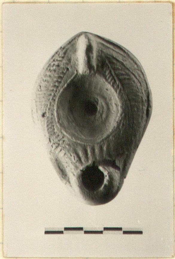 | Description: | Complete except for chips; mended from several pieces. Poor impression. On rim, palm leaf in relief. On discus, illegible impression. Tongue-pattern at base of nozzle. Thin knob-handle set squarely on top of discus. Bottom, shallow ridge with slight depression inside it. No glaze. Brownish-buff clay. Type XXXI of Corinth collection. | |