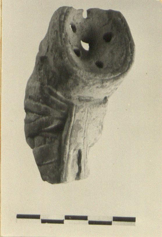 | Description: | The upper part of a plastic lamp with perforated top, modelled in the shape of a sandalled right foot. Traces of handle behind. Glaze red to brown, worn on outside. Pinkish-buff clay. ADDENDA RVN: Pobably this is a plastic pot: foot askos. | |