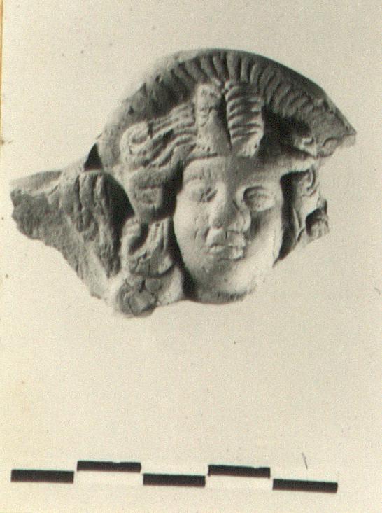 | Description: | Broken below and behind. Eros; a little of a wing preserved at his left. Heavy braid from forehead; curls at either side of face: rayed headdress. Eyes not pierced. Not a lamp, head from a figurine. Slight traces of red glaze. Light red clay. ADDENDA Same mold as T 874. | |