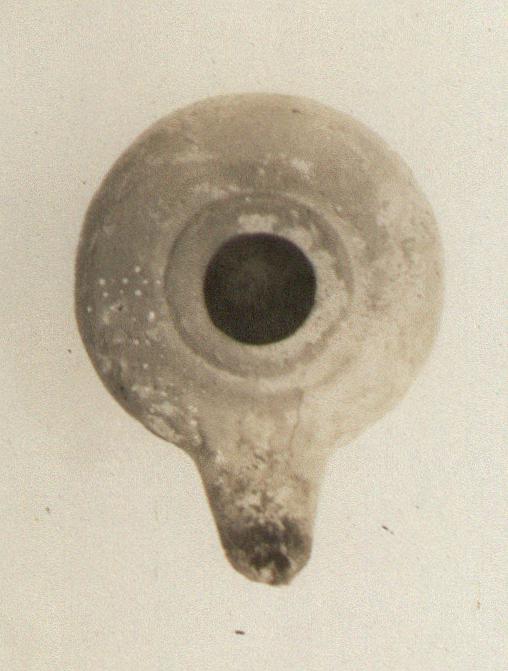 | Description: | Body with nearly vertical sides, curving in rapidly to base from point of greatest circumference. Broad top; meets sides at an angle; filling hole, surrounded by narrow insloping rim set off by broad groove. No handle. Small nozzle, pointed; its flat upper surface at lower level than that of lamp top. Raised rising base. Remains of cream slip. Pinkish-buff clay. Related to type VII and IX of Corinth collection, type 25A' of Agora collection. | |