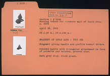 | Description: | Fragment giving handle and profile except bottom. Grooved handle with triangular attachment in form of palmette and volutes; grooved disc. Black glaze. Dark gray clay. Type XXI of Corinth collection. | |