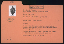 | Description: | Intact. Pierced handle; grooved above and below. Rosette on discus; dotted circles and dashes forming panels on rim. Incised signature, single letter, on bottom, within double almond-shaped grooves. No glaze. Reddish-buff clay. Type XXVIII of Corinth collection. | |