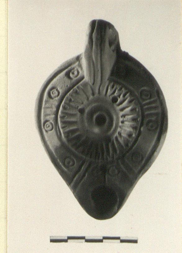 | Description: | Intact. Pierced handle; grooved above and below. Rosette on discus; dotted circles and dashes forming panels on rim. Incised signature, single letter, on bottom, within double almond-shaped grooves. No glaze. Reddish-buff clay. Type XXVIII of Corinth collection. | |