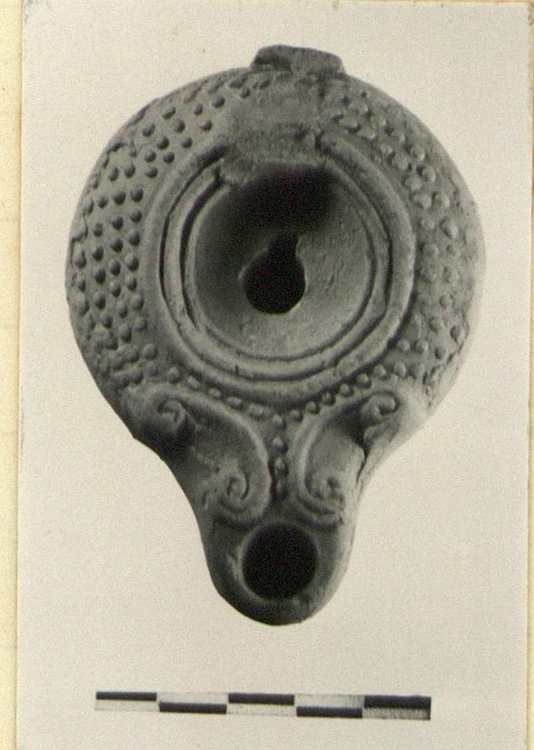 | Description: | Handle missing. Typical nodules and "alpha". Thin purple-red glaze. Type XX of Corinth collection. | |