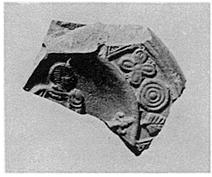 | Description: | Fragment of discus and rim. Rim sunk, with raised motifs: studded triangles, quatrefoil, concentric circles, leaf. Rather large discus, sunk, with relief picture: preserved upper part of male figure in armor (?), head right; and spearhead (?). Bright red clay and slip. Type XXXI of Corinth collection. | |