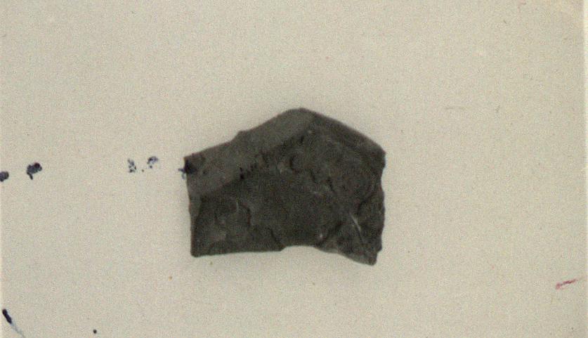Rather large discus, sunk, with relief picture: preserved upper part of male figure in armor (?), head right; and spearhead (?).