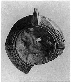 | Description: | Most of disk and handle preserved. Disc decorated with erotic symplegma. On rim, raised pattern and panels. Handle, pierced and grooved. Light gray clay with traces of orange. | |