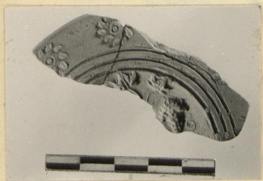 | Description: | Part of disk and rim preserved. Disc decorated with vine leaves and cluster in high relief, with three framing grooves. On rim, rosettes in relief. Fairly thin orange clay with lighter slip. | |