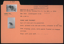 | Description: | Part of disk and rim preserved. Disc decorated with Artemis with bow and arrow, attended by her dog. Rim, sloping; plain, with panels flanked by stamped circles. Soft pink-buff clay. Late 2nd.-early 3rd. century. | |