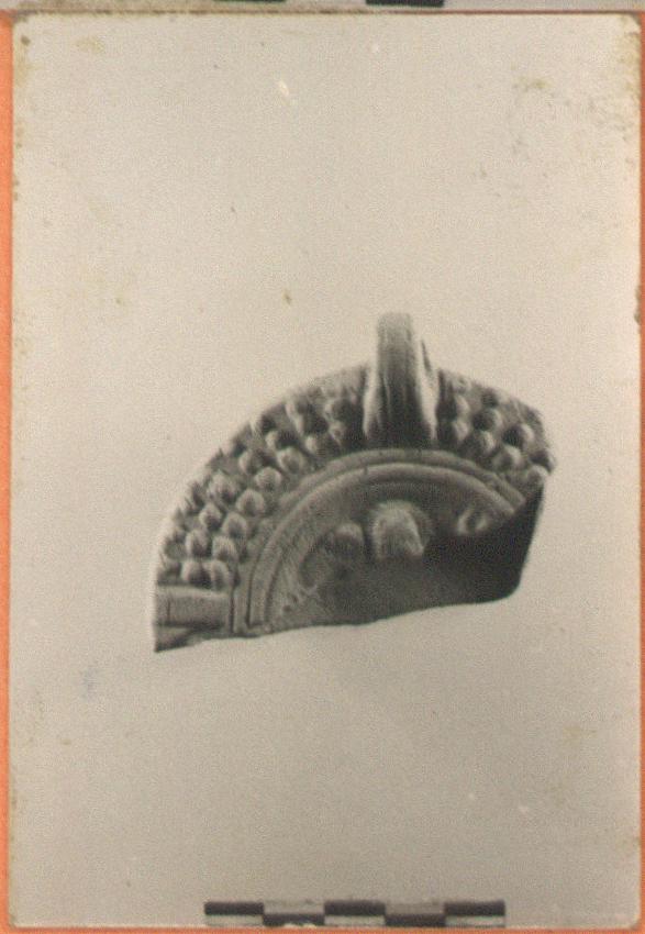 | Description: | Most of back half preserved. Disc, with head, right, and wings. Panelled rim with three rows of globules. Handles, pierced and grooved, with cross-strokes at end. On base within circular groove, relief outline of leaf partly preserved. Dull orange clay. Type XXVII of Corinth collection. 3rd. century, second half. | |