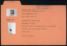 | Description: | Fragment of disc. Profile, left of bearded man in a cap with curving tip and fringed bottom. Buff clay. 4th. century. | |