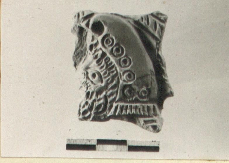 | Description: | Fragment of disc. Profile, left of bearded man in a cap with curving tip and fringed bottom. Buff clay. 4th. century. | |