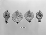 | Description: | End of nozzle chipped. Discus, decorated with two fishes. On rim, 8-S pattern, panels. Handle, pierced, three grooves above, two below. On base, within circular groove, incised branch flanked by letters "EY". Light buff clay. Type 27 (late) of Agora collection. | |