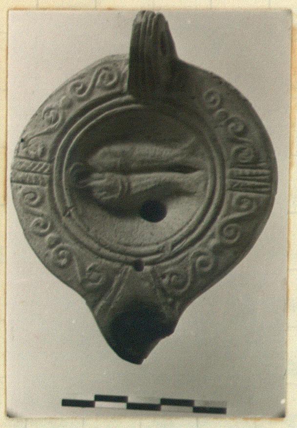 | Description: | End of nozzle chipped. Discus, decorated with two fishes. On rim, 8-S pattern, panels. Handle, pierced, three grooves above, two below. On base, within circular groove, incised branch flanked by letters "EY". Light buff clay. Type 27 (late) of Agora collection. | |