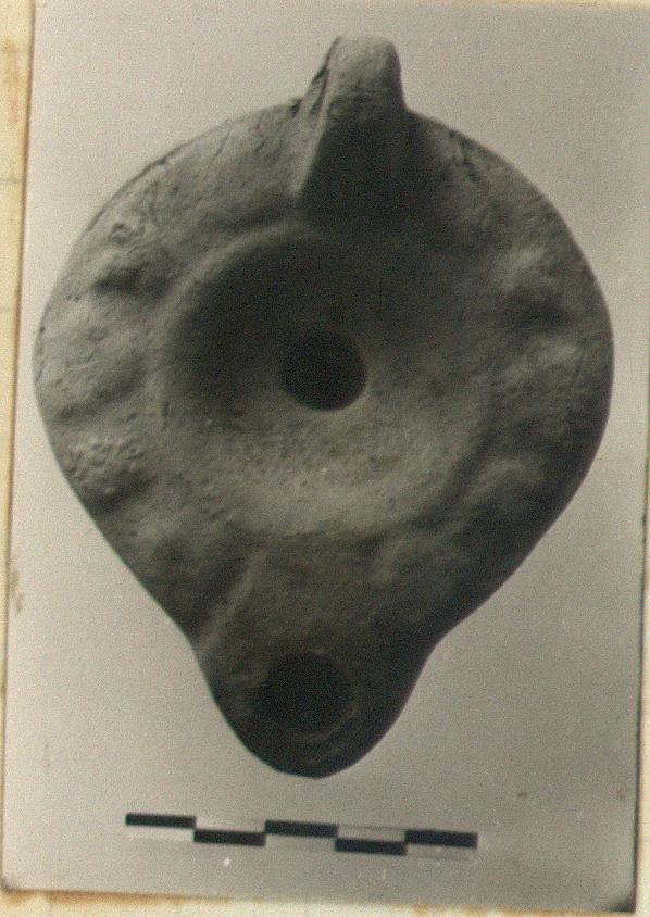 | Description: | Intact. From worn mould. Discus, plain; on rim, vine pattern. Handle pierced, three grooves above, two below. Reverse, five raised rings. Cracking clay, unevenly fired buff to orange. Type 27 of Agora collection. | |