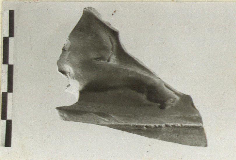| Description: | Broken all around. Fragment from base and part of superstructure of plastic lamp, with oil-hole set in top of base, showing a crouching or fallen animal, bull or deer. Probably from a combat scene. Red glaze. Pinkish-buff clay. | |