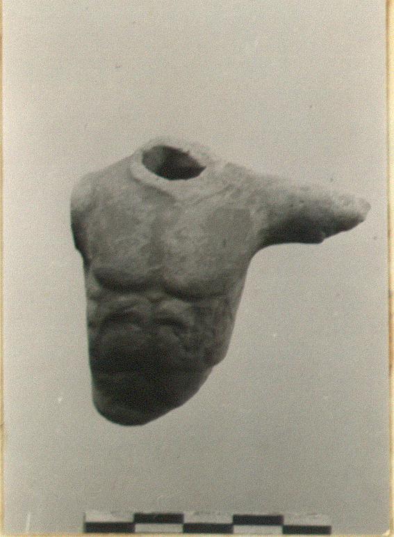| Description: | Fragment preserves torso to waist with upper part of outstretched left arm of male figure. Interior hollow. Thick red glaze on exterior. Porous red clay. | |