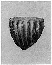 | Description: | Part of side, rim and spring of nozzle only preserved, from a large lamp. Lower wall ribbed. Small concentric circles on rim near nozzle. Purple-red glaze. Reddish-brown clay. | |