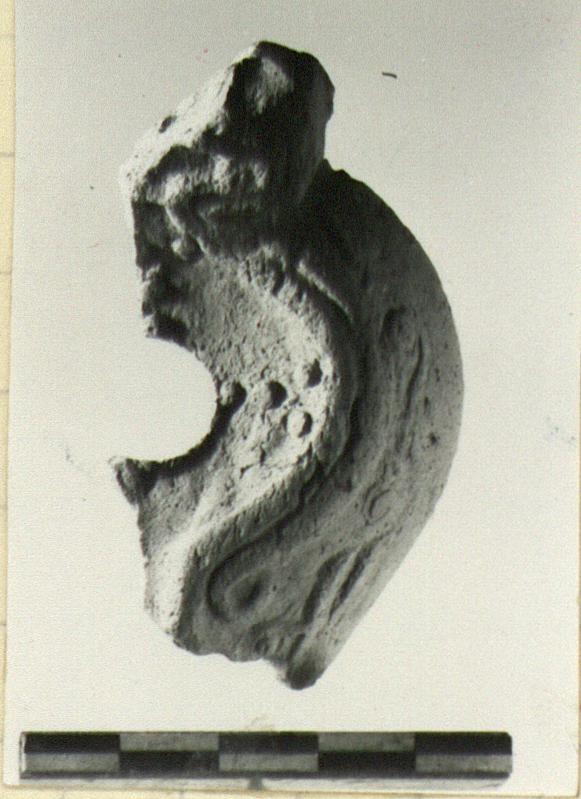 | Description: | Part of rim and discus preserved. Angular handle only partially preserved. High steep rim. Tendril on rim; groups of dots on discus. No trace of glaze. Dirty yellow clay. Very late Roman. | |
