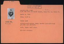 | Description: | Globule-and-volute lamp; handle, non-joining, grooved and pierced. Soft light buff clay. Mid. 3rd. century. | |