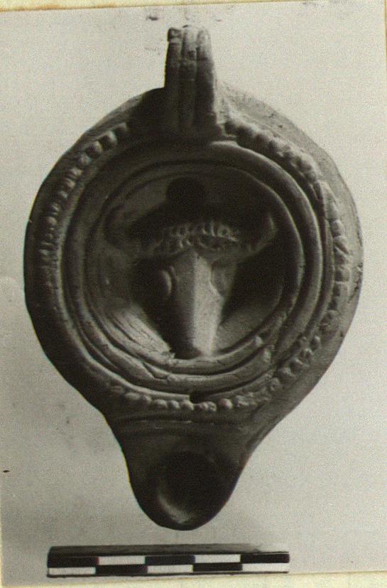 | Description: | Complete. Globules around rim, bull's head on discus. Five concentric circles incised in bottom. Handle not pierced through. Pink unglazed clay. | |