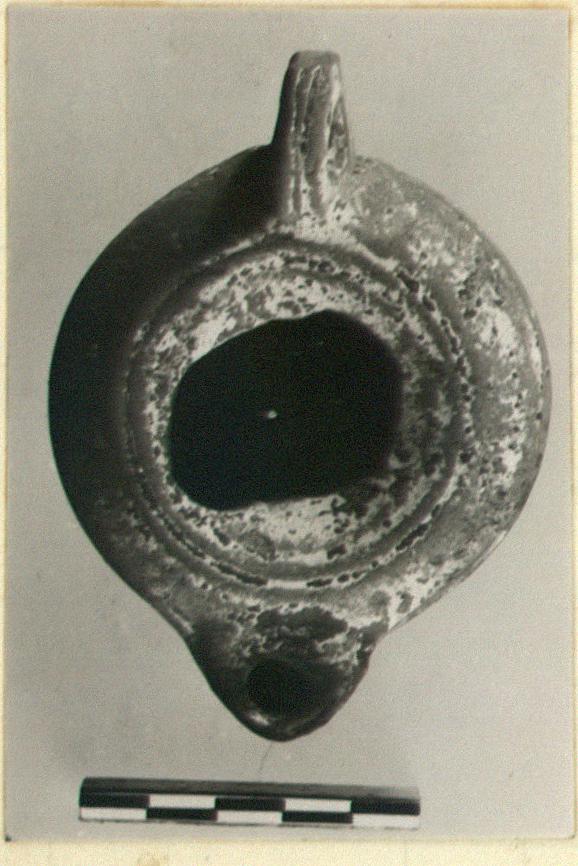 | Description: | Most of discus broken out; otherwise intact. Small plain nozzle; grooved handle; base ring. Micaceous brown clay, considerable remains of red and white. | |