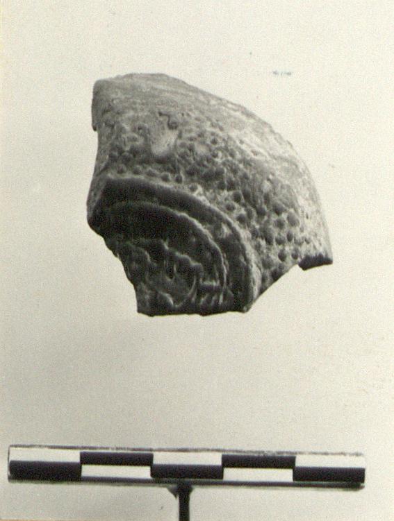 | Description: | Small globules on wall and top. On the bottom, within a ring, a head in relief outline, in profile to right. Very hard dark purple-red clay. | |