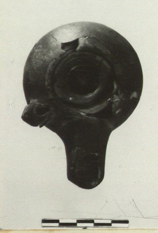| Description: | Mended from several fragments a few bits of top missing. Sunken top, reinforced ring; pierced lug on right side; small disk on bottom. Dull black glaze. Type 34A of Agora collection. Cf. L 713. | |