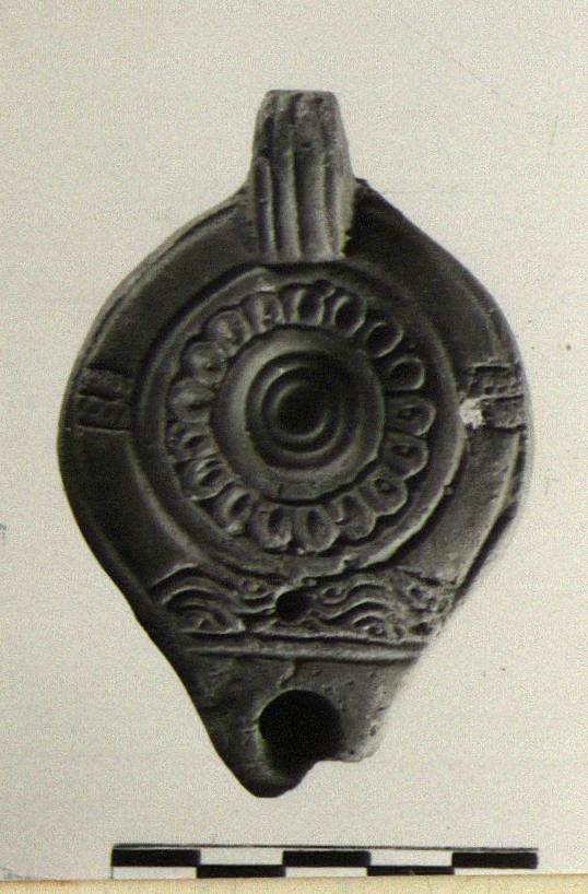 | Description: | Intact except for large chip from nozzle. Filling hole set low, three moulded rings, circle of ovules, moulded ring; flat narrow rim with two vertically grooved sections; groove. Unpierced, grooved handle, nozzle set off by transverse ridge with wavy line and air hole. Flat base, within two circles, branch. Orange glaze. Light orange clay. | |