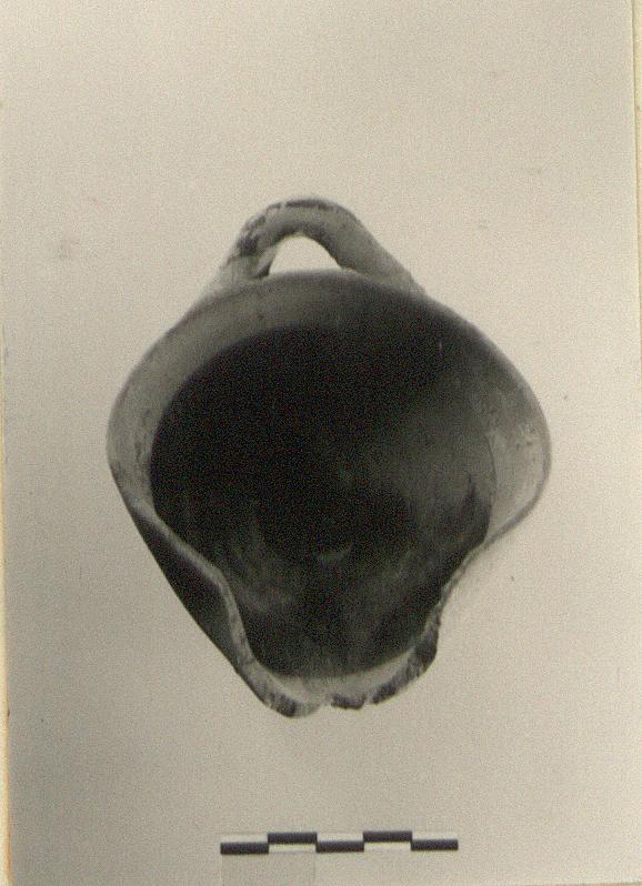 | Description: | Nozzle missing; otherwise intact. Saucer form with pinched in nozzle, rolled handle and flat base. Floor glazed and top of handle. Metallic dull black glaze, worn. Micaceous clay. Type 4 or 3 of Agora collection. | |