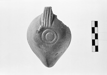 | Description: | Herringbone pattern on rim. On discus, rosette, with central filling hole. Handle solid, triple grooved. On base, double concentric circles. Red glaze. Red clay. Type XXVIII of Corinth collection. ADDENDA For nozzle cf. Corinth IV, ii, p. 105, fig. 49, no. 1. | |