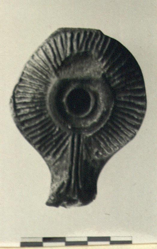 | Description: | Handle and end of nozzle missing; small hole in base. Otherwise complete. Base slightly concave. Large filling hole surrounded by a ridge. Raised rays on rim. Amorphous lug on left side. Thin black glaze. Orange clay. Type 52C of Agora collection. | |