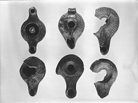 | Description: | Sharply double convex body, with large solid knob on left side. On top, wide raised band, sloping down toward filling hole. Long nozzle, rounded at end, the nozzle broadening toward the tip, where the wick hole is surrounded by a flattened band continuous with the small flattened top of the nozzle. Dull gray glaze, all over. Pale gray clay. Type XIX (Ephesus type: undecorated) of Corinth collection, Misc. Moulded type of Agora collection. ADDENDA Lamps L 551 to L 559 found together. A number of fragmentary lamps from the same pithos have been boxed separately, along with the finer sherds. See also pottery 589-630. | |