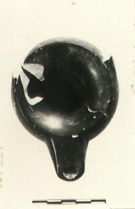 | Description: | Mended from two pieces. Missing are handle and chips from rim and sides. Raised base, slightly concave, reserved underneath. Rounded walls, rim plain and sloping toward center. Short nozzle, attachment for band handle. Metallic black glaze, peeling. Type 23C of Agora collection. Cf. L 5546. | |