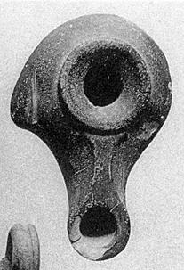 | Description: | Sharply double convex body, with large solid knob on left side. On top, wide raised band, sloping down toward filling hole. Long nozzle, rounded at end, the nozzle broadening toward the tip, where the wick hole is surrounded by a flattened band continuous with the small flattened top of the nozzle. Dull gray glaze, all over. Pale gray clay. Type XIX (Ephesus type: undecorated) of Corinth collection, Misc. Moulded type of Agora collection. ADDENDA Lamps L 551 to L 559 found together. A number of fragmentary lamps from the same pithos have been boxed separately, along with the finer sherds. See also pottery 589-630. | |