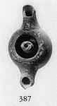 | Description: | Lamp with two opposite nozzles and central tube. Top of the body broken. Wheel made. Double convex body, with flat bottom, and a narrow flat rim round a fairly large central opening. From the bottom of a lamp, through the central opening and extending a little above and sides, passes a hollow conical tube. Fairly long nozzles, with blunt irregular ends, one chipped, and large wick holes. Slightly rounded on top. Thin black glaze about half turned to a dull red; somewhat chipped. Glazed over all. Pinkish-buff clay. Type IV (late variants) of Corinth collection, type 27D of Agora collection. ADDENDA Lamps L 551 to L 559 found together. A number of fragmentary lamps from the same pithos have been boxed separately, along with the finer sherds. See also pottery 589-630. For profile cf. Corinth IV, ii, p. 32, fig. 14, profile 45. | |