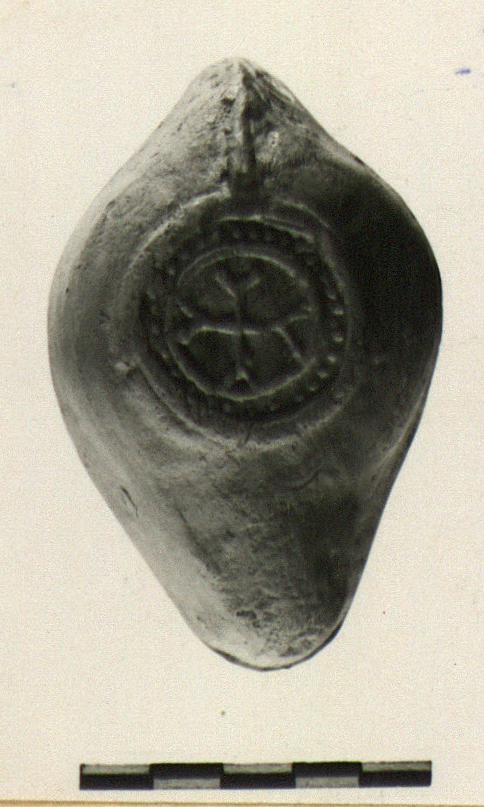 On disc, cross with split ends in circle, surrounded by circles within circles. Flat rim, herringbone. Knob handle. Some burning at wick hole.