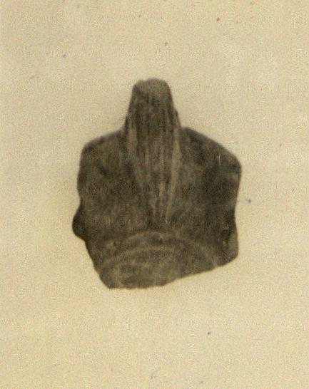 | Description: | Fragment from back part. On rim, herringbone (?); small bit preserved. Handle solid; double grooved above and below. On bottom, circular groove, enclosing signature, upper part only preserved: "EY". Type XXVIII of Corinth collection. | |