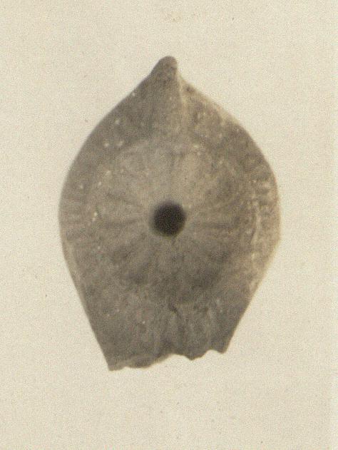 | Description: | Nozzle broken away. Rim, sloping downwards from edge of discus; tongue pattern. On discus, rosette round central filling hole. Handle small, solid, double grooved. Nozzle, does not interrupt rim pattern. On bottom, low base ring; in the center a depression, suggesting a footprint, the five toes faintly indicated, but the narrowing at the instep much exaggerated (?). Unglazed. Buff to pink clay. Type XXVIII of Agora collection. | |