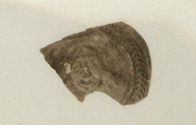 | Description: | Part of discus and rim. On rim, herringbone. On discus, mask, with projecting twisted horns (?), sidewise, from behind ears; mold much worn. Front part of discus, with filling hole below chin, broken away. Dull purplish glaze. Light red clay. Type XXVIII of Corinth collection. | |