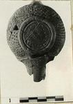 | Description: | Mended from many pieces. Missing handle, end of nozzle, fragments from body. Base slightly raised, has sloppy relief "alpha" within irregular circle of globules. Red glaze over red clay. | |