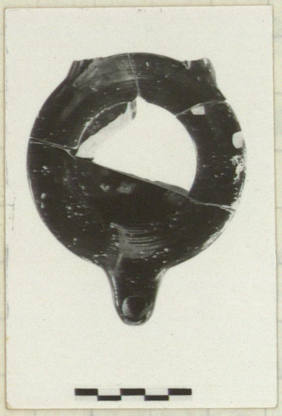 | Description: | Mended from four pieces. About one-forth of bottom missing. Ring base. Rim at sharp angle to body. Rim slopes inward slightly. Small nozzle with small wick hole. Strap handle. Reserved: underside, resting surface, handle panel. Black glaze. Pink clay. Type 19 variant of Agora collection. Ca. end of 6th. century to 480 B.C. | |