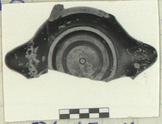 | Description: | Over half preserved, with two nozzles and base of handle. Third nozzle missing. Low ring foot with flat resting surface. Resting surface reserved. Underside reserved and miltosed with two glazed circles and central dot. Low wall meets top at angle. Base of horizontal strap handle. Handle panel reserved and miltosed. Short nozzle with large wick hole. Black to green glaze. Cf. Kerameikos XI, nos. 39-40. Agora IV, type 23B, but with nozzle panel glazed. GLThorikos (1983), no. 141. | |
