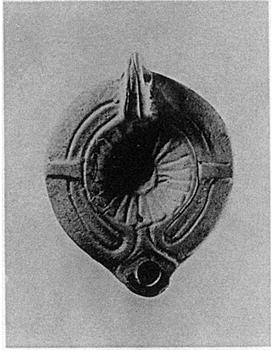 Description:   Rim, divided by groove into two plain bands, the inner one depressed; plain bands form panels at sides; at the nozzle the outer bands curve round the inner, to the edge of the discus. Between these bands, another, starting at the discus, divides on either side of the small round nozzle.